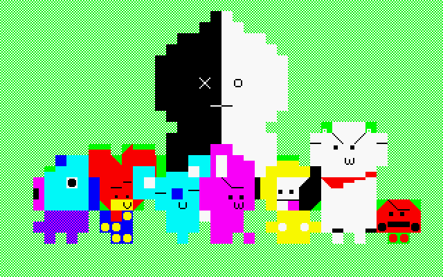 クリスマスツリーにMZ-700の ゲームキャラ(のつもり)を紛れ込ませてみました。雪を降らせてホワイトクリスマス。。 |